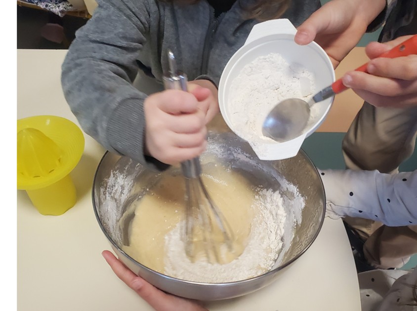 Pour la vente des gâteaux de la période 4, les CM2 sont venus dans la classe des maternelles pour cuisiner. Chaque binôme de CM2 avait la charge de faire un gâteau avec 5 maternelles.