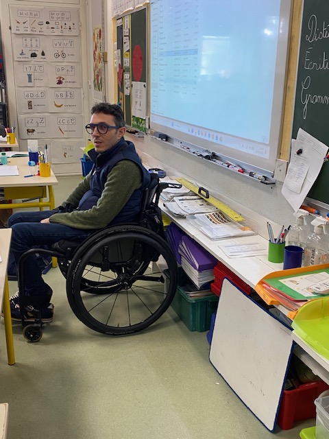 Denis a répondu aux questions des élèves avec beaucoup de générosité. Nous avons appris qu’il travaillait, faisait du sport et avait une vie de famille. Nous avons compris comment il faisait pour que ce soit possible : avec un matériel adapté et avec de l’aide humaine, selon les situations.